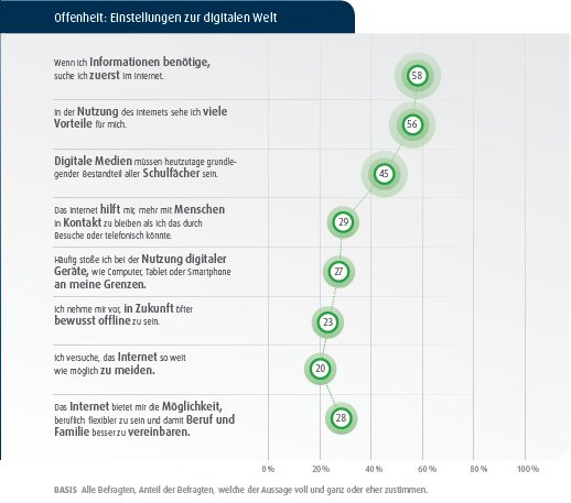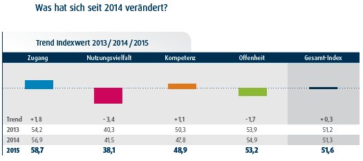 Der „Digitalisierungsgrad der Bevölkerung“ liegt in Deutschland aktuell bei 51,6 Indexpunkten und damit 0,3 Punkte über Vorjahresniveau. Das hat der „Digital-Index 2015“ der Initiative D21 und des Bundesministeriums für Wirtschaft und Energie ergeben. Bei der Vorstellung der „umfangreichsten und aussagekräftigsten Studie zur Entwicklung der Digitalen Gesellschaft“ bleibt unklar, ob dies ein ermutigendes oder eher maues Zwischenergebnis ist.