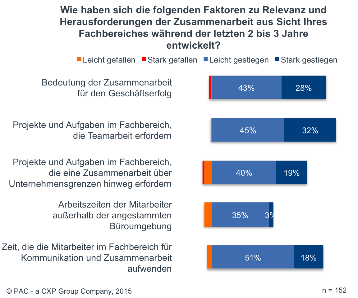 Eine aktuelle Studie zum Thema „Zusammenarbeit in virtuellen Teams in deutschen Unternehmen“ von PAC behauptet, dass der intensive Austausch aller Beteiligten Voraussetzung für die Bewältigung der digitalen Transformation ist. Dies lässt sich gut nachvollziehen, wenn es um funktionierende Teamarbeit geht, die eigenverantwortliche Selbstorganisation mit umfasst. Laut haufe.de verzeichnen aktuell bereits 70 Prozent der Manager verstärkte Zusammenarbeit. Demnach verbringen Mitarbeiter rund ein Drittel ihrer Arbeitszeit mit Kommunikation und Kollaboration.