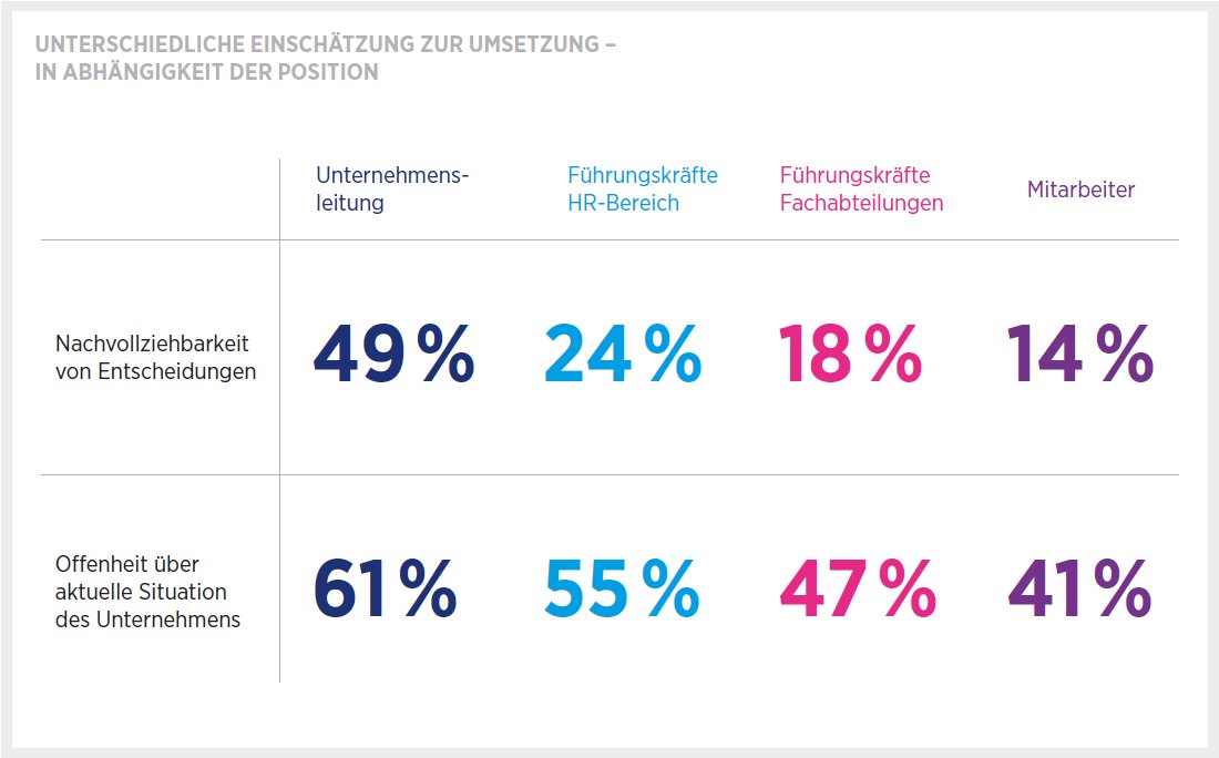 Der Studie zufolge handelten alle Unternehmen bei diesen als wichtigste genannten Themen zu wenig. In Sachen Unternehmenskultur sind die Unternehmen nach Aussagen der Entscheider durchweg nur befriedigend aufgestellt. So halten beispielsweise 81 Prozent der Befragten den offenen Umgang mit kritischen Themen für wichtig, aber nur 23 Prozent sehen das bereits umgesetzt. Die agile Unternehmensorganisation erscheint demnach als ein geeignetes Mittel, um ein Unternehmen auf den digitalen Wandel einzustellen und dabei auch einen kulturellen Wandel zu erzielen.