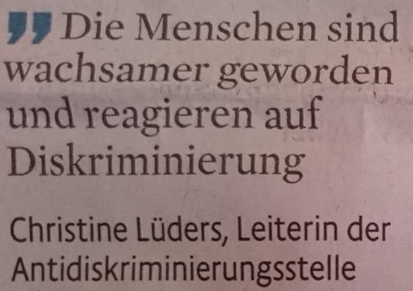 Wachsamkeit_KStA_10.08.2016In zehn Jahren haben sich der Zeitung zufolge rund 15.000 Menschen an die Antidiskriminierungsstelle gewandt. Diese Zahl fällt angesichts von fast 28 Millionen Diskriminierungsfällen in Deutschland (rund ein Drittel der Bevölkerung) sehr gering aus.